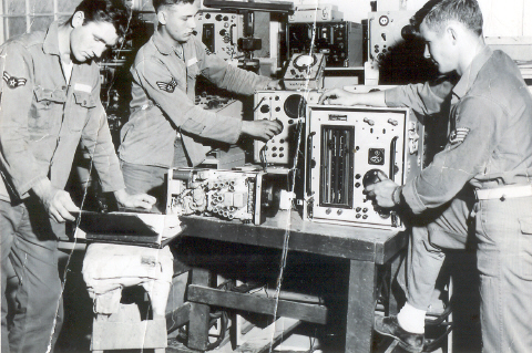 F-86F at DowF-86D at DowMajor John A. Bell, Commanding OfficerMajor Hayden H. Holton, Squadron Executive Officer1st Lt. Oliver N. Jackson Squadron AdjutantOperations OfficeLittle Baker and some birds ready to leap offM/Sgt John Camp, 1st SergeantValet service to the hangar, courtesy of John Clark.Time for a tuneupMission accomplished! All the birds back safely.C-47 at Dow. Tom Statler is Crew ChiefT-33 at DowJoe Chatfield, Paul Scoskie, and Tom Morrisey fine tune the radar for an F-86D.Buck Madruga on his T-33Gary Ferrol and Leland Goss take a break outside the Power ShopDan Ferguson gets a bird ready to flyNote the names on the two planes – on the left ‘Miss Citizen’. On the right-‘Miss Canuck’ They are Staff McDougall’s plane, one before he became an American citizen and one after. That’s Staff on the left and Don Findlay on the rightGordon Baker borrows a buck till payday from Paul MurphyDon Harbert, Gary Ferrol, Joe Skurka, and ‘Hagar’ Ray Fratus outside the DayroomCarl Threadgill, (?), and Van Cooney get ready to hit the beachConnie Swokla & Ben Frisby at a barracks party‘Red’ McGaffic, Jerry Page, and Lee ‘Breezie’ Briner. That’s not JP-4 they’re drinking!Bill Cooper, an Oiler who can read. Wow!!!Right-L-R: Front-Carl Threadgill, Arnie Cohen, Ed Bliss, John Szucs. Rear- Denny Tyrrell, Bob Thomalen, Ron German, (?) , Russ Oliver, Ed Roman, Frank Vincent, Bill BorusThis was not a prayer meeting in the barracks. Seated: Arnie Cohen Standing: Bob Thomalen, Russell Oliver, Ed Roman. Back row: Bill Borus. Remember Schlitz?Right: Red McGaffic, Mike Dargatis, Ron Lavoie, Ray “Hagar” Fratus, Bob KrobothLeft: Bill Aldorisio, Bob Thomalen, Bob Kroboth, Mike Dargatis, Red McGaffic at Yuma.Forget the scramble-I’ve got a full house going here! Lavoie, Thomalen, and Zimmerman at Yuma.121’s radar is fine, says Ron Lavoie at Yuma.No, it’s not Baryshnikov, it’s Vollbach at Bar Harbor.All dressed up on the flight line? L-R: Unknown, Walter “The Spider” Markot, Tom Morrissey.Cole Worthy waking Ben FrisbyConnie Swokla getting Neatness Award on KP at historic Camp Dow on the PenobscotPaul Scoskie in the Sight ShopTwo F-86Ds waiting to go upF-84B at Dow AFB, Bangor, ME. Note the red and white squadron color markings on the aircraft.Hangar at Dow. Note: P-47s, B-26, and F-84s. The changing of the guard has begun.