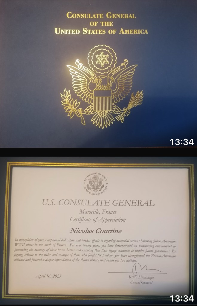 In April 2025, the French people continued to show honor and respect for our WW II P-38 pilots who paid the ultimate sacrifice. Their dedication and heartfelt emotions leaves us with a deep appreciation of our mutual friendship with them. Memorial ceremonies were hosted by the Municipality of Travaillan. As in previous years, there were two ceremonies. The first was held at the Plan de Dieu monument and was a tribute honoring 5 pilots who fell for freedom in 1944. (Lts Crandall, Duggleby, Semple, Simpson, and Tracy). The second ceremony was held at the Travaillan cemetery in honor of Lts. Crandall and Duggleby.
